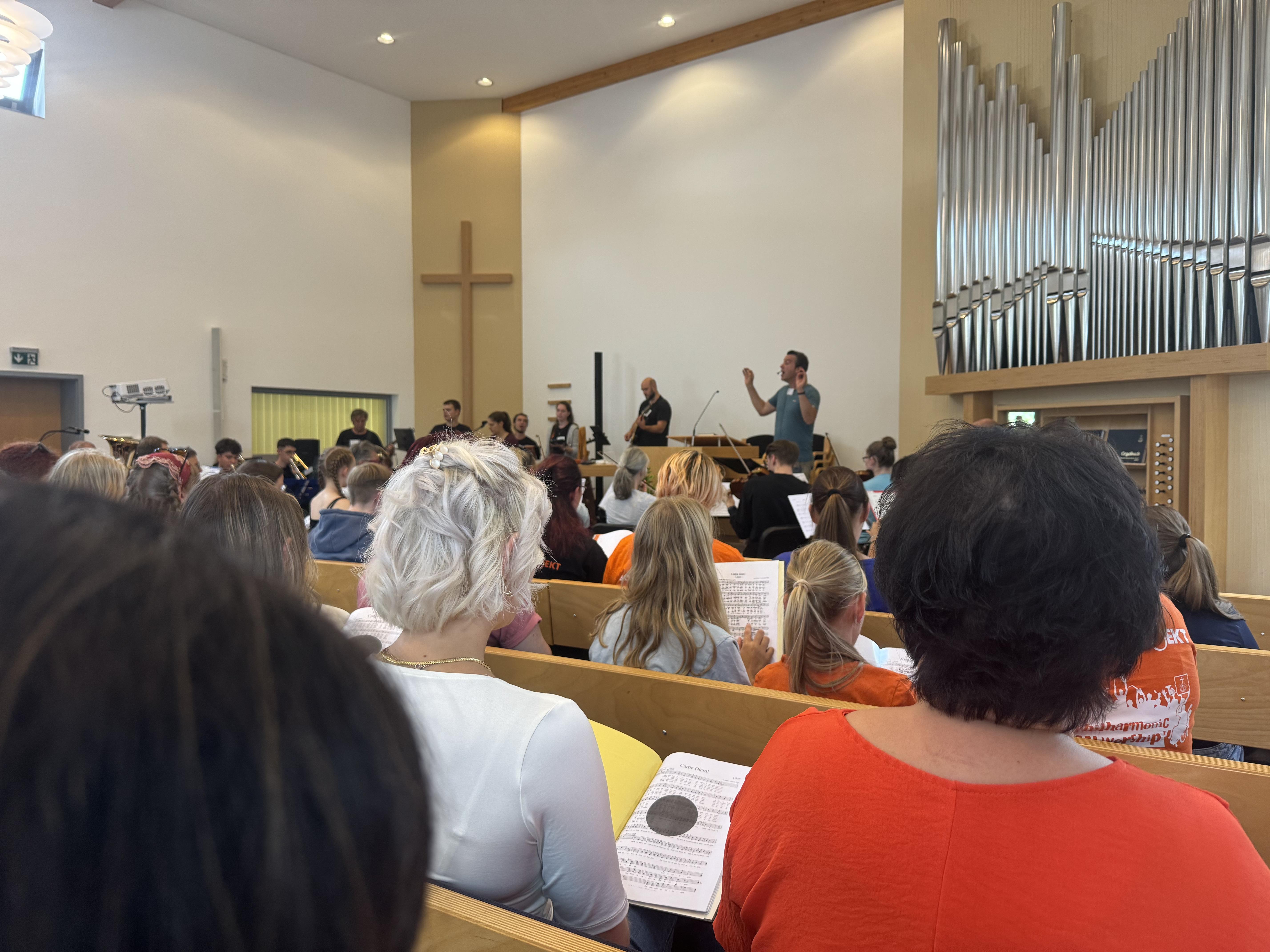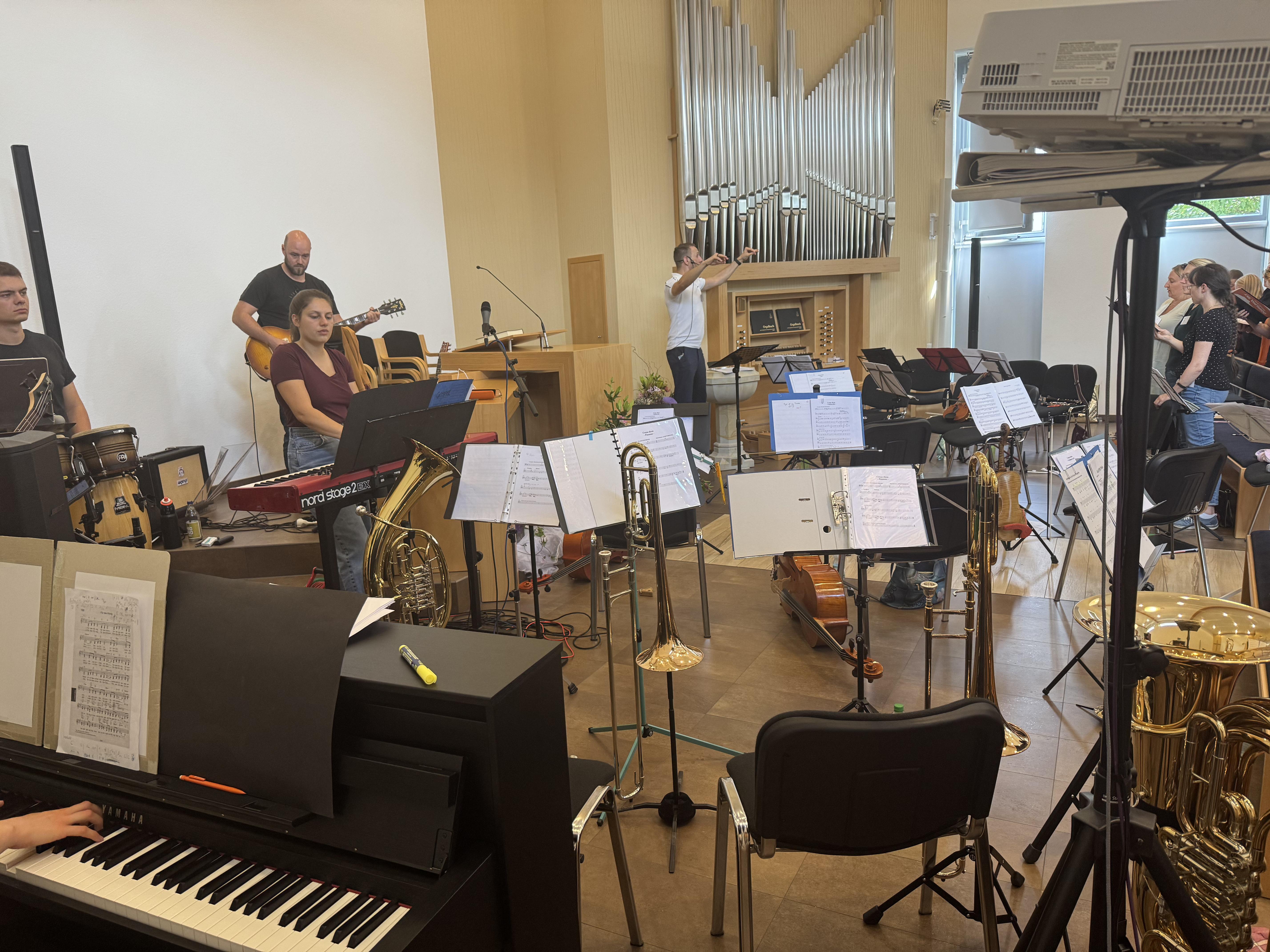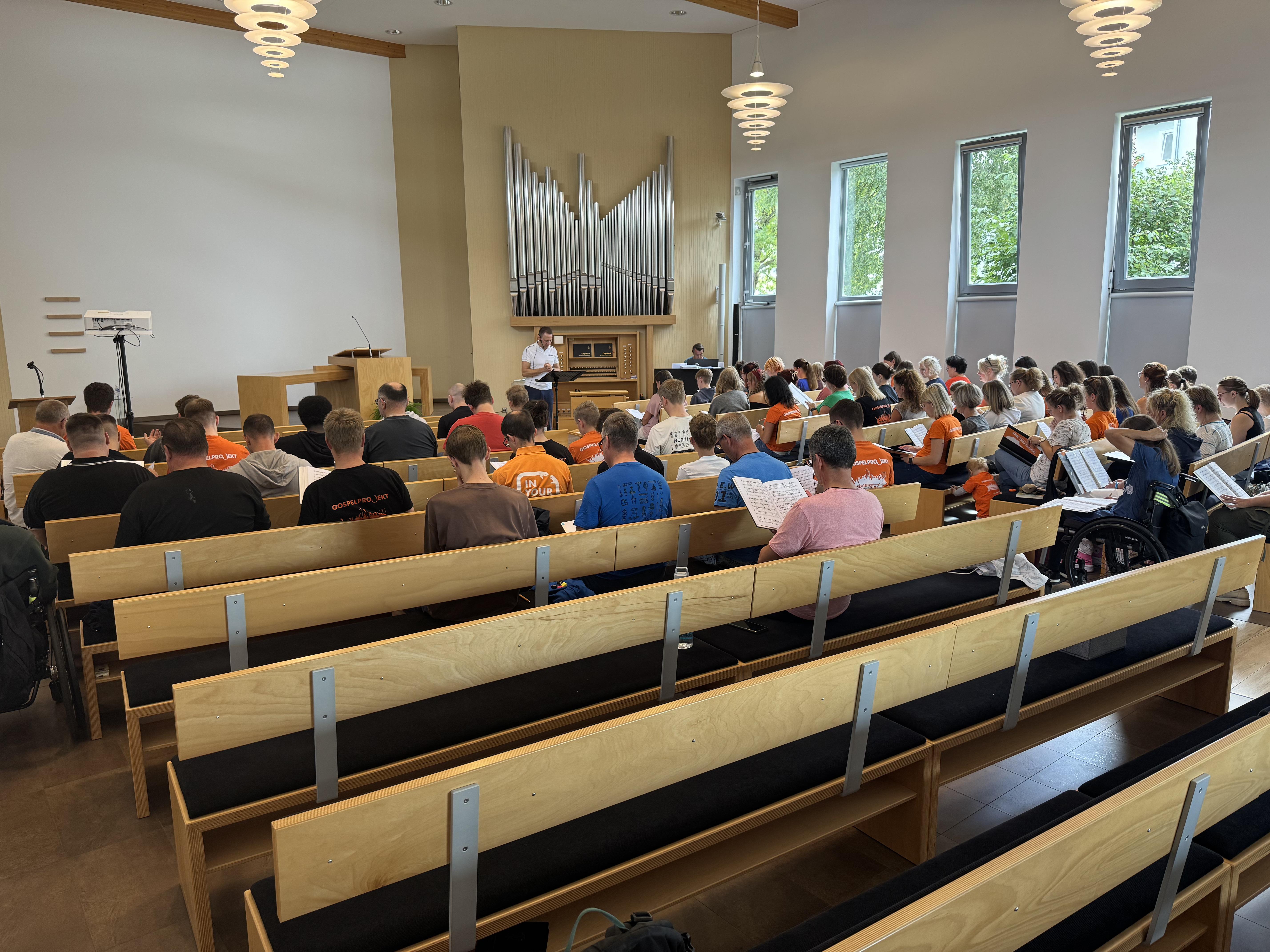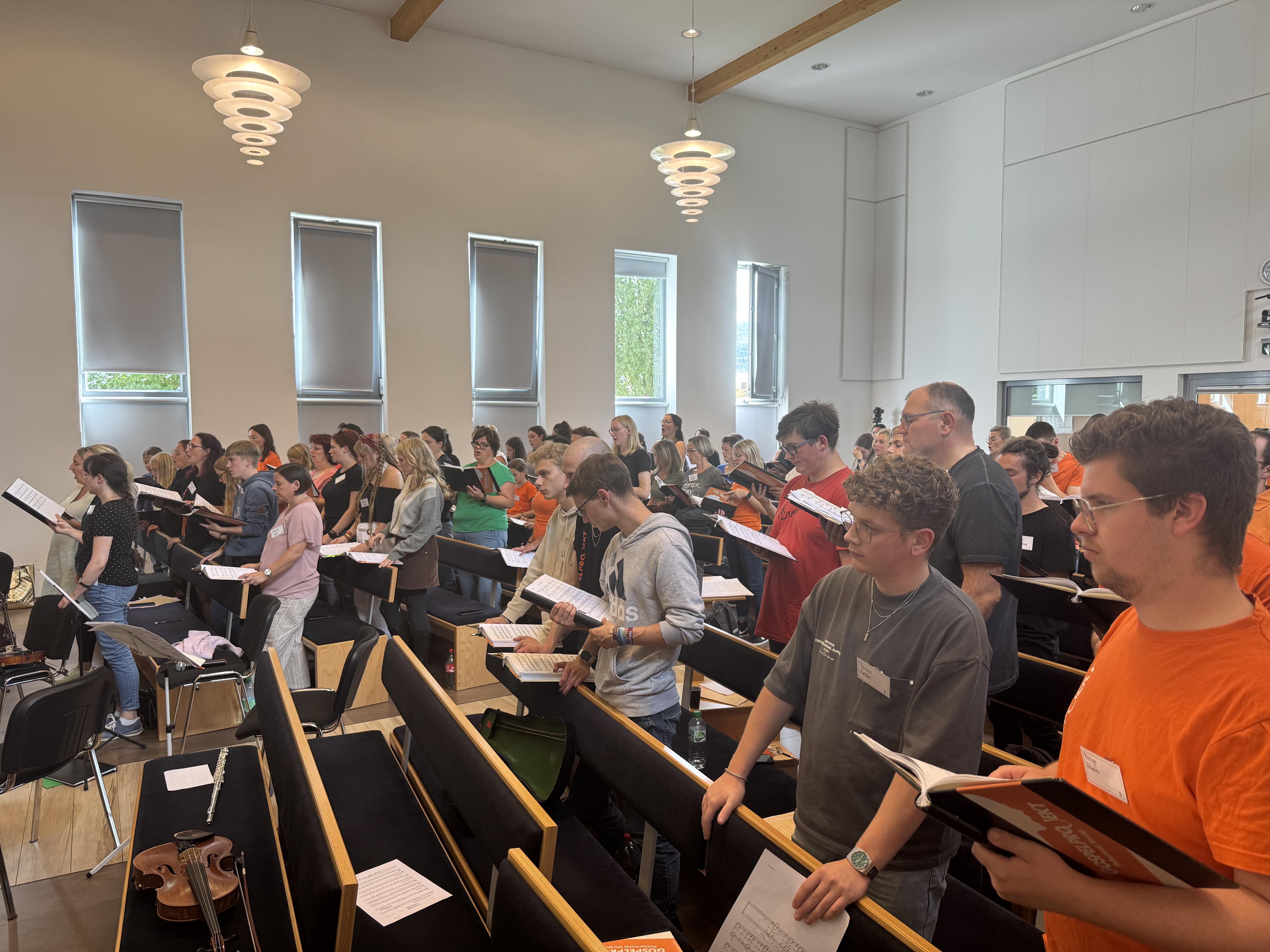 In der Neuapostolischen Kirche Ilmenau probten die Sängerinnen und Sänger zusammen mit der Band. Es wurde intensiv an Dynamik, Rhythmus und Ausdruck gearbeitet. Trotz konzentrierter Arbeit war die Atmosphäre von Freude geprägt. Immer wieder gab es Szenen, in denen man merkte: Jetzt passt alles zusammen – Chor, Band und Leitung auf einer Wellenlänge.