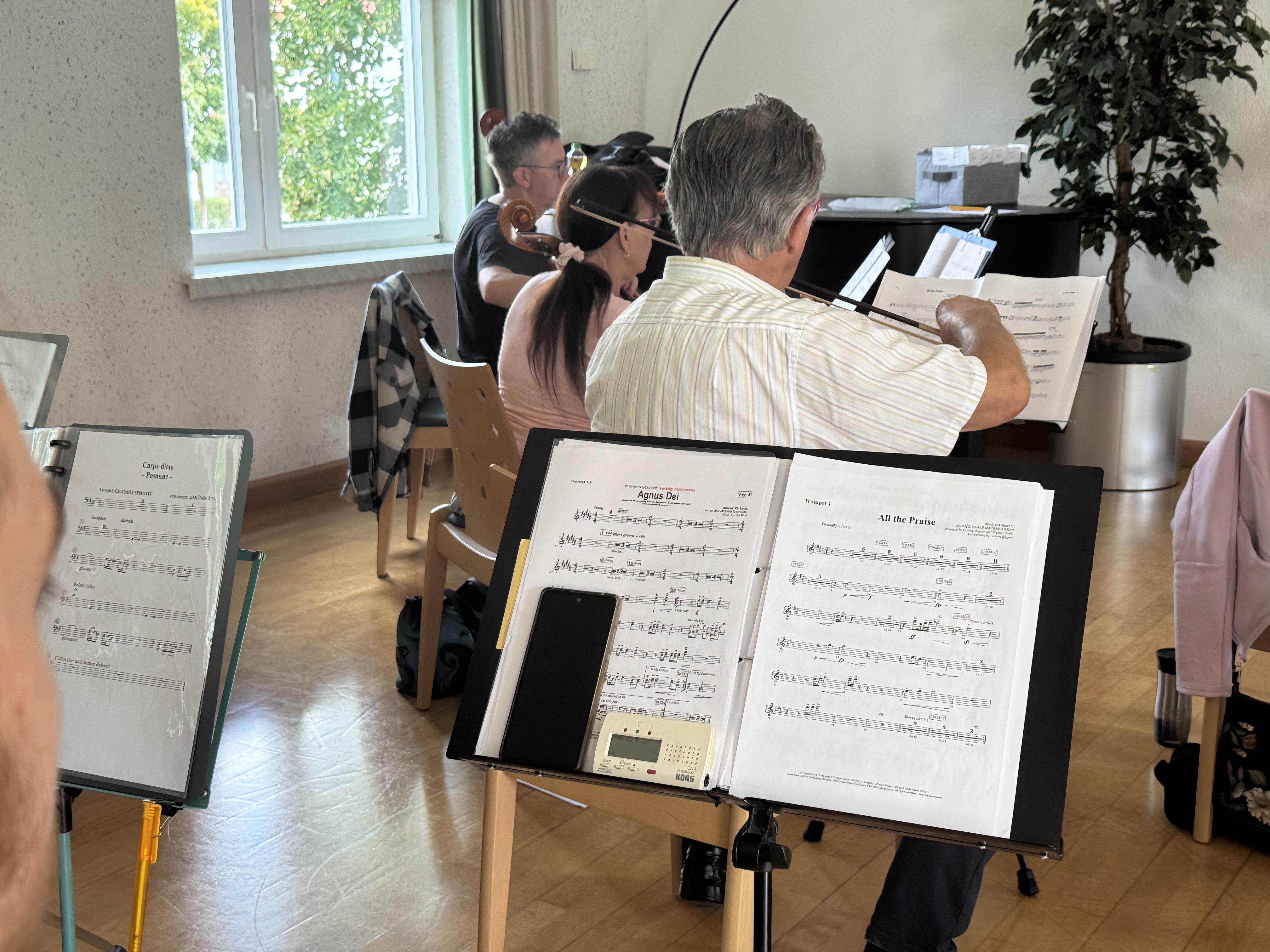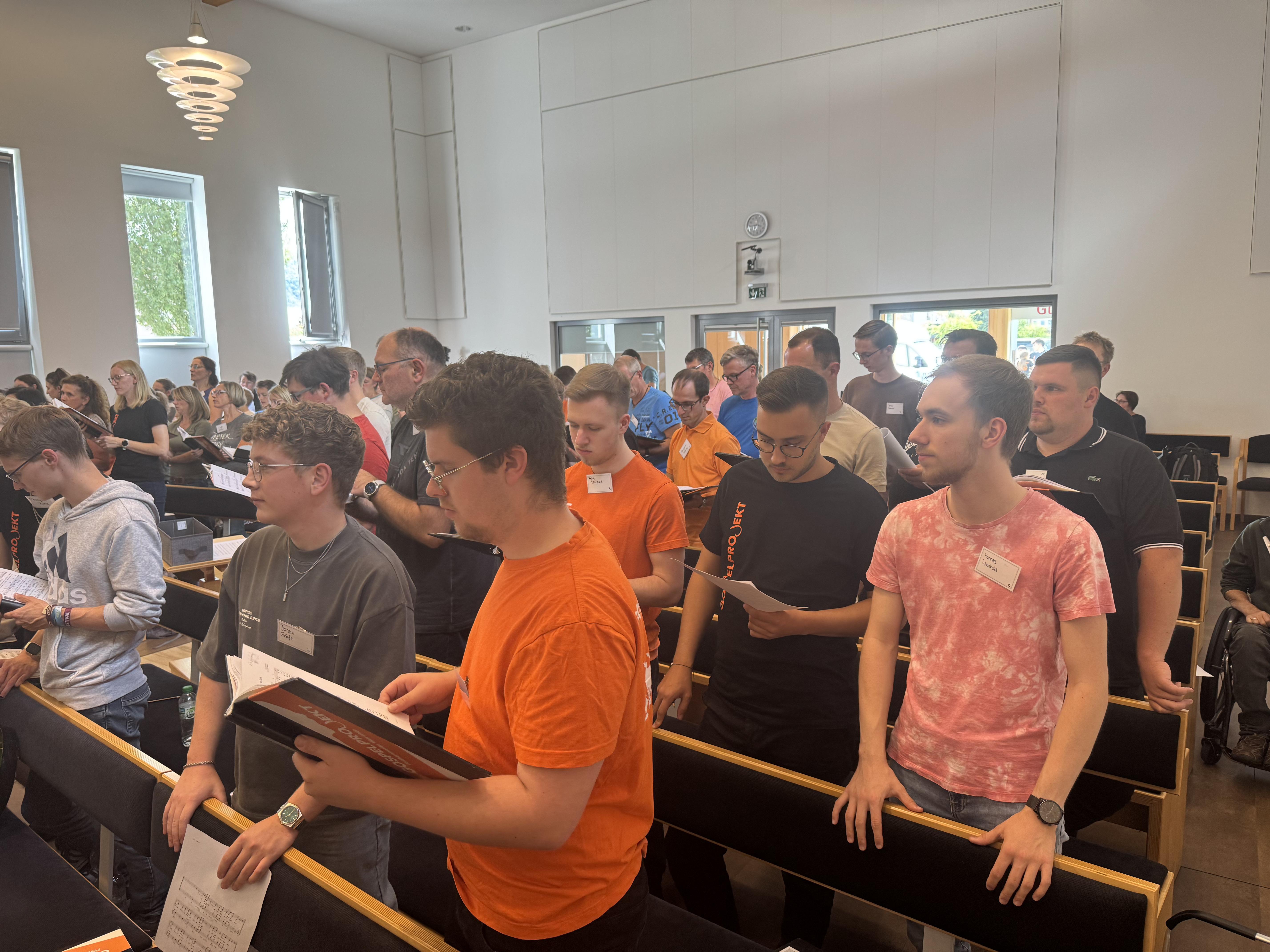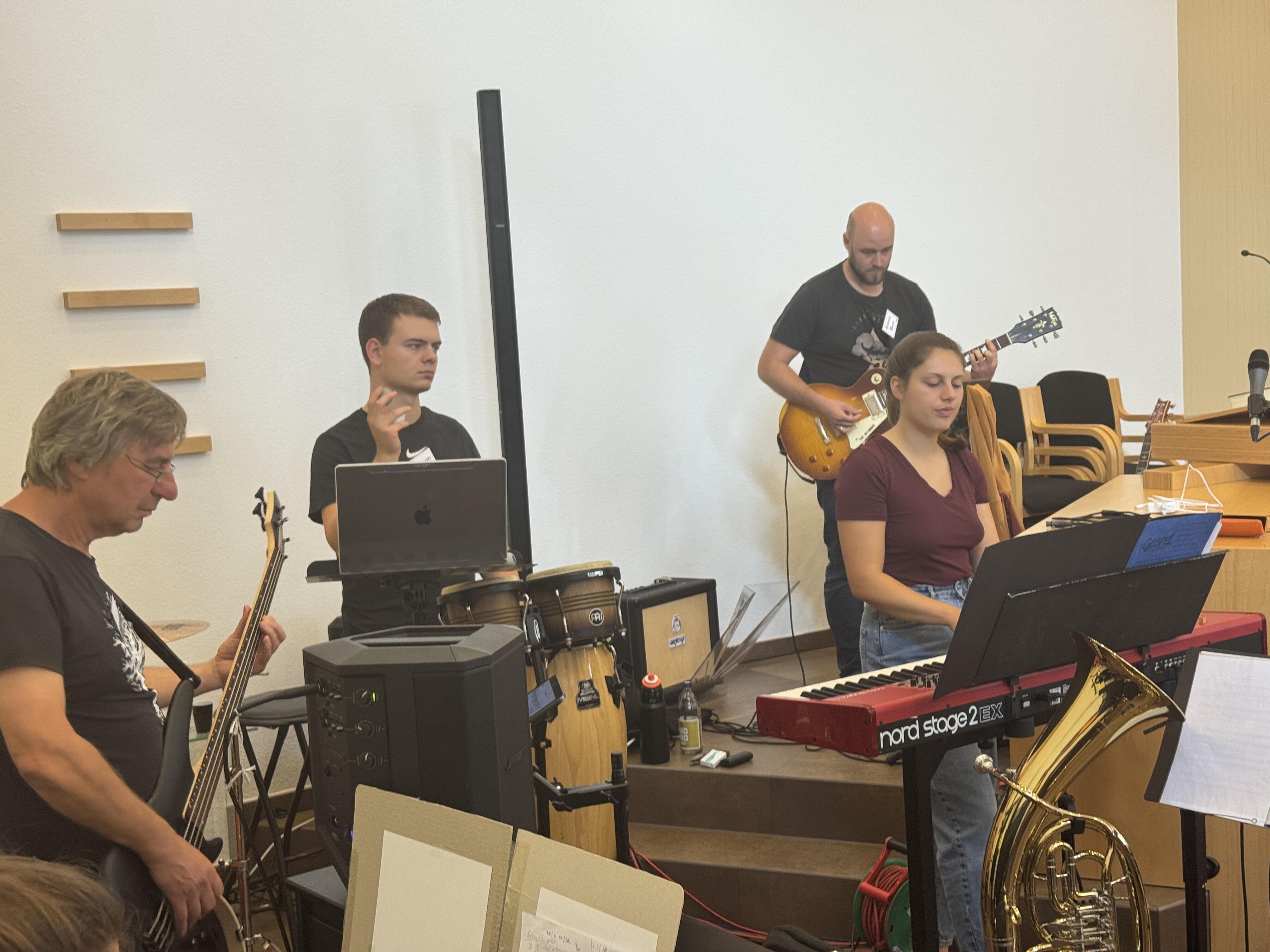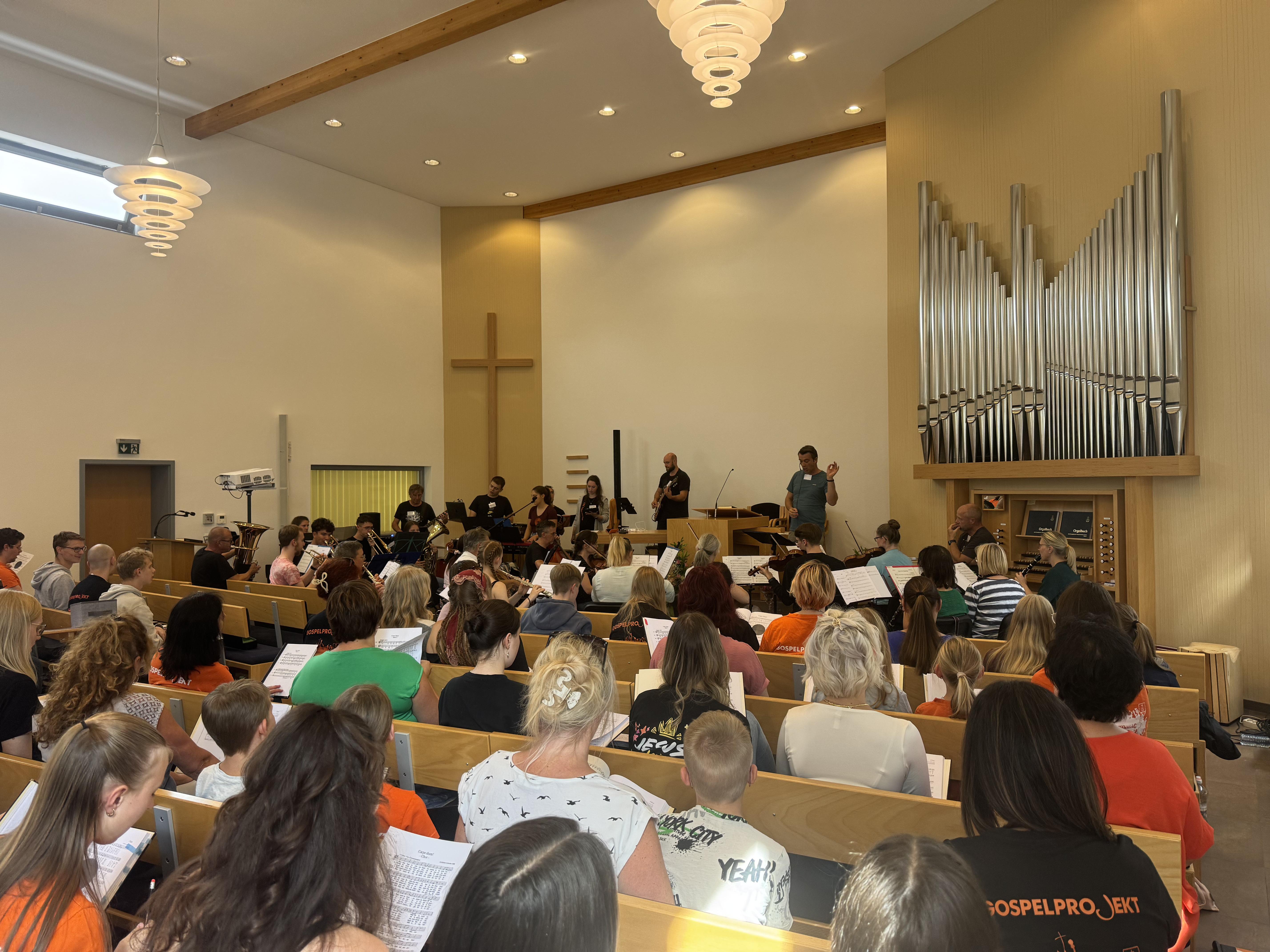 In der Neuapostolischen Kirche Ilmenau probten die Sängerinnen und Sänger zusammen mit der Band. Es wurde intensiv an Dynamik, Rhythmus und Ausdruck gearbeitet. Trotz konzentrierter Arbeit war die Atmosphäre von Freude geprägt. Immer wieder gab es Szenen, in denen man merkte: Jetzt passt alles zusammen – Chor, Band und Leitung auf einer Wellenlänge.